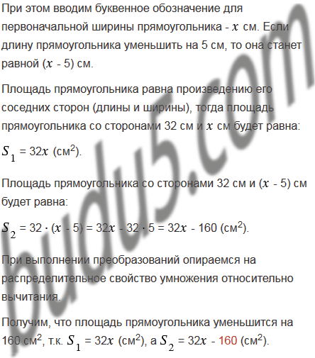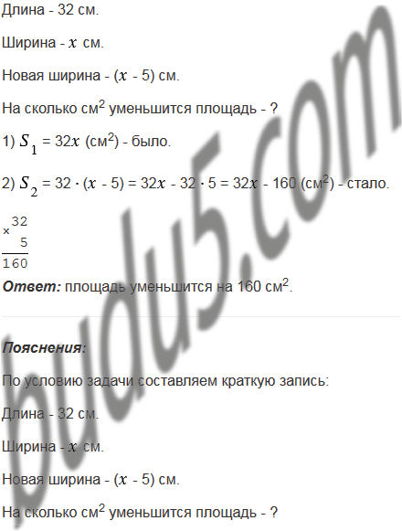 Длина прямоугольника равна 32 см. На сколько квадратных сантиметров уменьшится площадь этого прямоугольника, если его ширину уменьшить на 5 см?