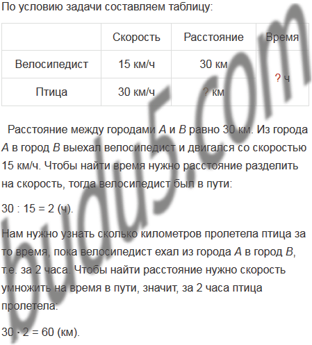 Расстояние между городами А и В равно 30 км. Из города А в город В выехал велосипедист и двигался со скоростью 15 км/ч. Одновременно из города В в направлении города А вылетела птица со скоростью 30 км/ч. Встретившись с велосипедистом, птица развернулась и полетела назад. Прилетев в город В, она снова развернулась и полетела навстречу велосипедисту. Встретившись с ним, птица развернулась и полетела назад в город В и т.д. Сколько километров пролетела птица за то время, пока велосипедист ехал из города А в город В?
