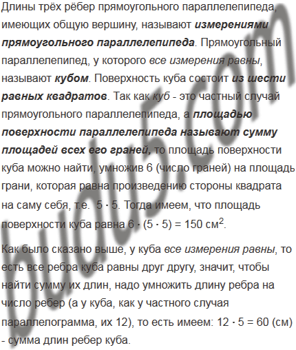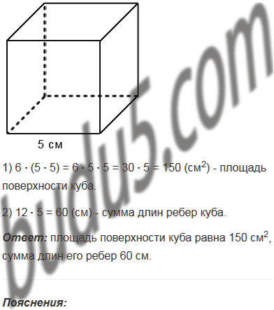 Вычислите площадь поверхности и сумму длин всех рёбер куба (рис. 171), ребро которого равно 5 см.