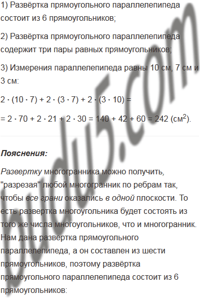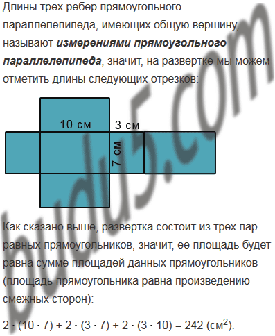 3) Какова площадь этой развёртки, если измерения параллелепипеда равны 10 см, 7 см и 3 см?