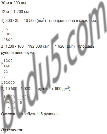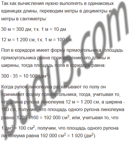 В школьном коридоре, длина которого равна 30 м, ширина - 35 дм, надо заменить линолеум. Какое наименьшее количество рулонов линолеума для этого нужно, если длина рулона линолеума равна 12 м, а ширина - 160 см?