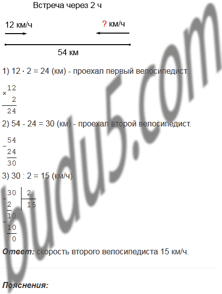 Из двух населенных пунктов, расстояние между которыми равно 54 км, одновременно выехали навстречу друг другу и встретились через 2 ч после начала движения. Скорость движения первого велосипедиста составляла 12 км/ч. С какой скоростью двигался второй велосипедист?