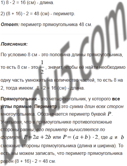 Ширина прямоугольника равна 8 см, что составляет половину его длины. Вычислите периметр прямоугольника.