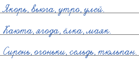 Якорь, каюта, сирень, вьюга, ягода, утро, ёлка, огоньки, маяк, улей, сельдь, тюльпан.