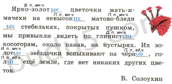 Ярко-золот__ цветочки мать-и-мачехи на невысок__ матово-бледн__ стебельках, покрытых пушком, мы привыкли видеть по глинист__ косогорам, около канав, на пустырях. Их золот__ звёздочки вспыхивают на чёрн__, гол__ ещё земле, где нет никаких других цветов.