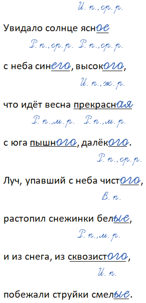 • Укажите падеж и род у имён прилагательных в единственном числе и падеж у имён прилагательных во множественном числе.