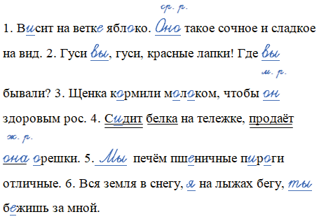 1. В_сит на ветк_ ябл_ко. ___ такое сочное и сладкое на вид. 2. Гуси ___, гуси, красные лапки! Где ___ бывали? 3. Щенка к_рмили м_л_ком, чтобы ___ здоровым рос. 4. С_дит белка на тележке, продаёт ___ _решки. 5. ___ печём пш_ничные п_р_ги отличные. 6. Вся земля в снегу, ___ на лыжах бегу, ___ б_жишь за мной.