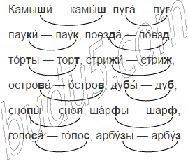 луга́ — ..., пауки́ — ..., поезда́ — ..., то́рты — ..., стрижи́ — ..., острова́ — ..., дубы́ — ..., снопы́ — ..., ша́рфы — ..., голоса́ — ..., арбу́зы — ... .