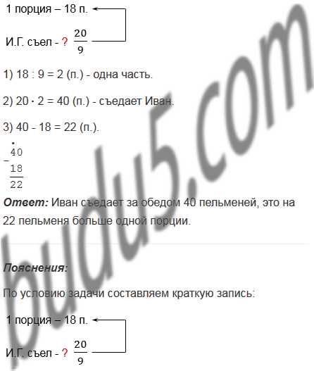 порции. Сколько пельменей съедает за обедом Иван? На сколько пельменей больше одной порции он съедает?