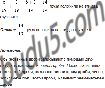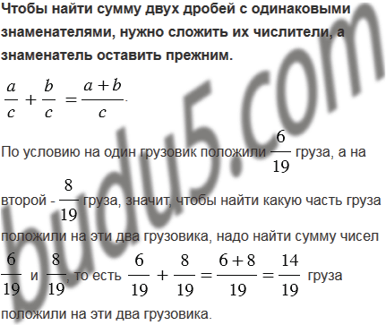 Для перевозки груза использовали несколько грузовиков. На один из них положили груза, а на второй - груза. Какую часть груза положили на эти два грузовика?