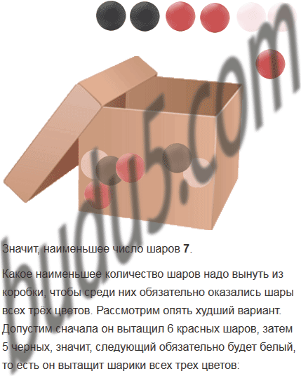 В коробке лежат 4 белых, 5 чёрных и 6 красных шаров. Какое наименьшее количество шаров надо вынуть из коробки, чтобы среди них обязательно оказались: 1) 3 шара одного цвета; 2) шары всех трёх цветов?