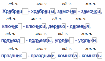 Храбрец - храбрецы, замо́чек — ..., ключик2 — ..., де́рево — ..., друг1 — ..., подъезд — ..., уголёк — ..., праздник — ..., комната — ... .