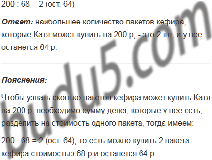 Пакет кефира стоит 68 р. У Кати есть 200 р. Какое наибольшее количество пакетов кефира она может купить? Сколько денег останется у Кати?