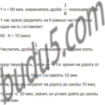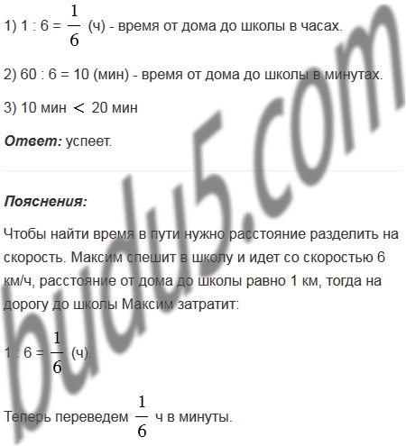 Максим спешит в школу и идет со скоростью 6 км/ч. Успеет ли Максим дойти до школы за 20 мин, если его дом находится на расстоянии 1 км от нее?