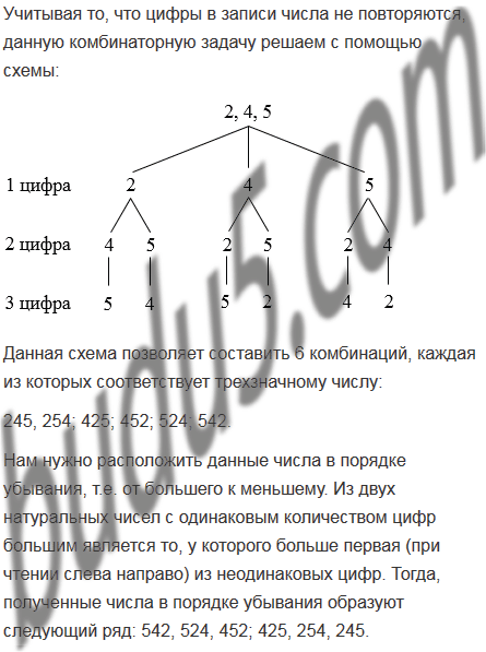 Расположите в порядке убывания все трехзначные числа, которые можно записать с помощью цифр 2, 4 и 5 (цифры в записи числа не повторяются).