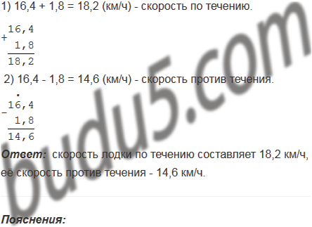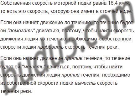 Собственная скорость моторной лодки равна 16,4 км/ч, скорость течения - 1,8 км/ч. Найдите скорость лодки по течению и её скорость против течения.