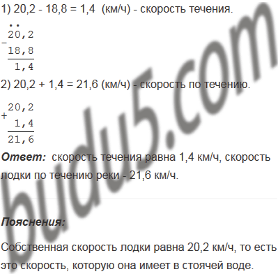 Скорость лодки против течения реки равна 18,8 км/ч, а её собственная скорость - 20,2 км/ч. Найдите скорость течения и скорость лодки по течению реки.