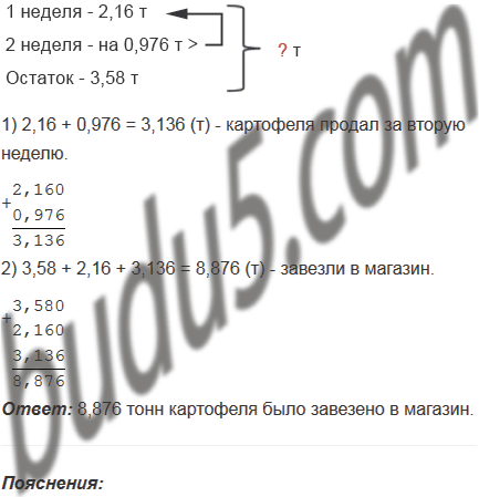 За первую неделю магазин продал 2,16 т картофеля, а за вторую на 0,976 т больше, чем за первую. После этого в магазине ещё осталось 3,58 т картофеля. Сколько тонн картофеля было завезено в магазин?