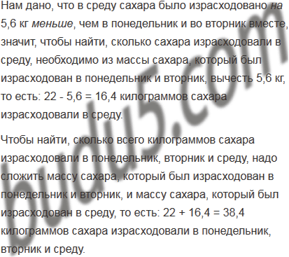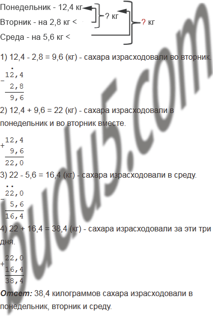 В понедельник в столовой израсходовали 12,4 кг сахара, что на 2,8 кг больше, чем во вторник. В среду сахара было израсходовано на 5,6 кг меньше, чем в понедельник и во вторник вместе. Сколько всего килограммов сахара израсходовали в понедельник, вторник и среду?