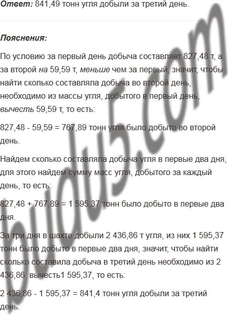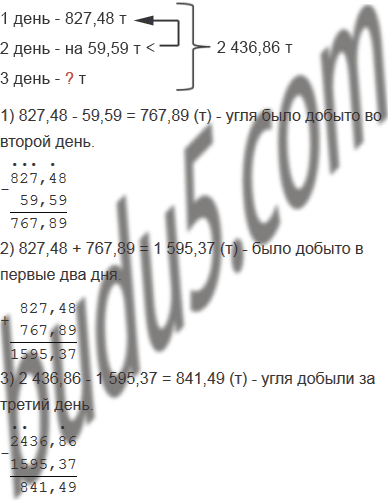 За три дня в шахте добыли 2 436,86 т угля. За первый день добыча составляет 827,48 т, а за второй на 59,59 т, меньше чем за первый. Сколько тонн угля добыли за третий день?