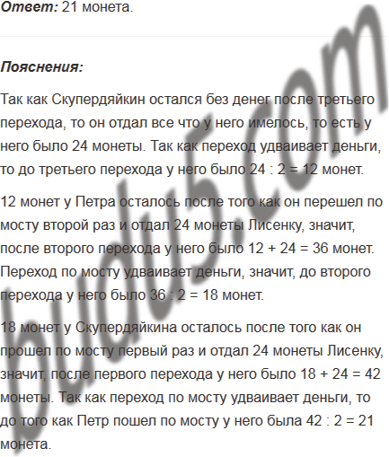 Хитрый Лисёнок предложил Петру Скупердяйкину: "Каждый раз, когда ты перейдёшь мост, который я заколдую, твои деньги удвоятся. За это будешь мне отдавать 24 монеты". Сделал Скупердяйкин так три раза и остался совсем без денег. Сколько денег было у Петра до встречи с Хитрым Лисёнком?