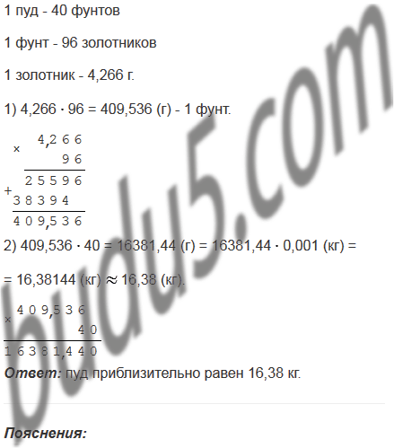 В старину в России пользовались такими мерами массы: пуд, фунт, золотник. Пуд был равен 40 фунтам, фунт - 96 золотникам. Скольким килограммам равен пуд, если золотник равен 4,266 г? Ответ округлите до сотых.