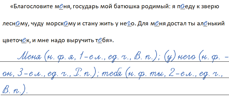 "Благословите м_ня, государь мой батюшка родимый: я п_еду к зверю лесн_му, чуду морск_му и стану жить у не_о. Для м_ня достал ты ал_нький цветоч_к, и мне надо выручить т_бя".