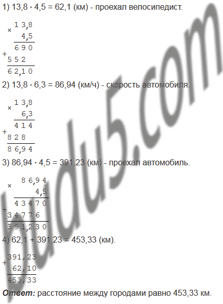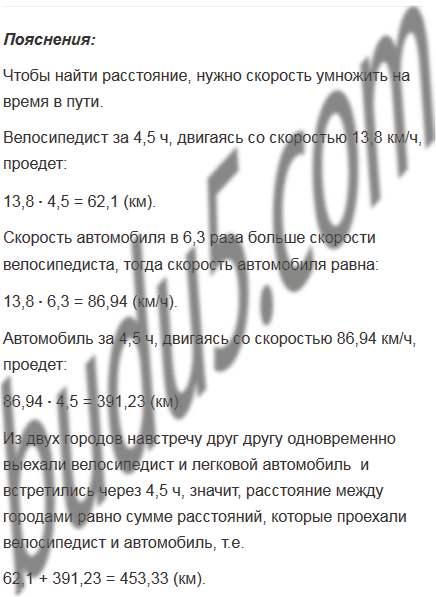 Из двух городов навстречу друг другу одновременно выехали велосипедист и легковой автомобиль. Велосипедист ехал со скоростью 13,8 км/ч, а автомобиль - в 6,3 раза быстрее. Найдите расстояние между городами, если велосипедист и автомобиль встретились через 4,5 ч после начала движения.