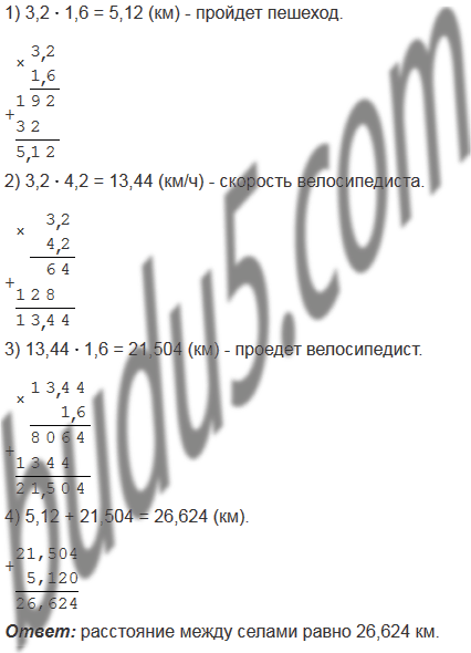 Из двух сел навстречу друг другу одновременно начали движение велосипедист и пешеход. Пешеход шел со скоростью 3,2 км/ч, что в 4,2 раза меньше скорости велосипедиста. Найдите расстояние между селами, если велосипедист и пешеход встретились через 1,6 ч после начала движения.