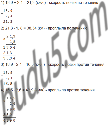 Лодка плыла 1,8 ч по течению реки и 2,6 ч против течения. Какой путь проплыла лодка за все время движения, если скорость течения равна 2,4 км/ч, а собственная скорость лодки - 18,9 км/ч?