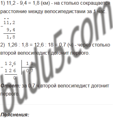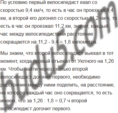 Из села Уютное со скоростью 9,4 км/ч выехал велосипедист. Когда он отъехал от Уютного на 1,26 км, следом выехал второй велосипедист со скоростью 11,2 км/ч. За какое время второй велосипедист догонит первого?