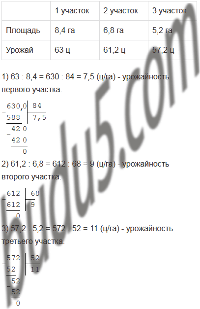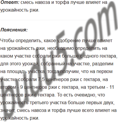 На три участка поля площадью 8,4 га, 6,8 га и 5,2 га было завезено удобрение: на первый - навоз, на второй - торф, а на третий - смесь навоза и торфа (в одинаковом количестве на 1 га). Урожай ржи с этих участков соответственно составил: 63 ц, 61,2 ц и 57,2 ц. Какое удобрение лучше влияет на урожайность ржи?