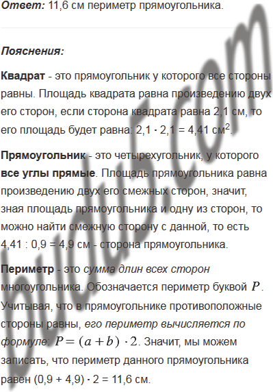 Площадь прямоугольника равна площади квадрата со стороной 2,1 см. Одна из сторон прямоугольника равна 0,9 см. Вычислите периметр прямоугольника.