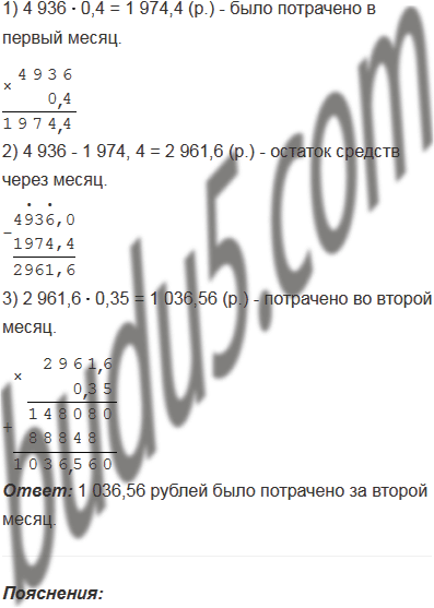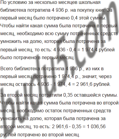 За несколько месяцев школьная библиотека потратила 4 936 р. на покупку книг. За первый месяц было потрачено 0,4 этой суммы, а за второй - 0,35 оставшейся суммы. Сколько денег было потрачено за второй месяц?