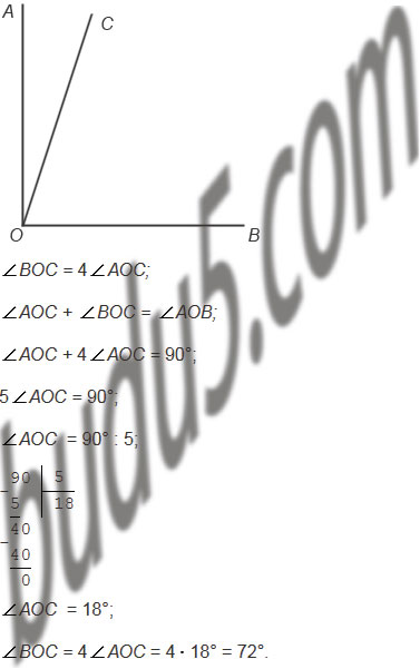 Луч ОС делит прямой угол АОВ на два угла так, что угол АОС в 4 раза меньше угла ВОС. Найдите градусные меры углов АОС и ВОС.