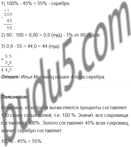Илья Муромец, победив Соловья-разбойника, нашел в его логове 80 пудов золота и серебра. Золото составляло 45% сокровищ. Сколько пудов серебра нашел Илья Муромец?
