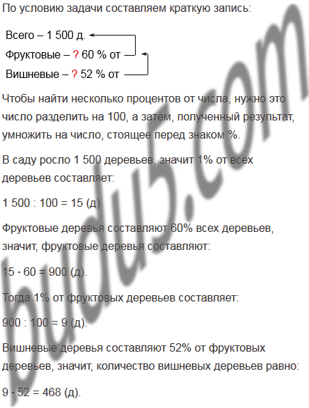 В саду росло 1 500 деревьев, из них 60% составляли фруктовые деревья. Вишневые деревья составляли 52% фруктовых деревьев. Сколько вишневых деревьев росло в саду?