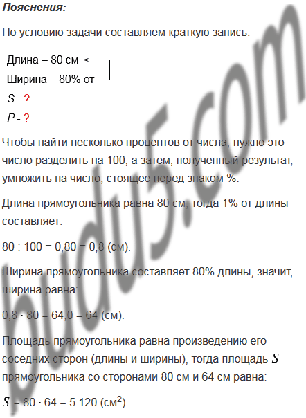 Длина прямоугольника равна 80 см, его ширина составляет 80% длины. Найдите периметр и площадь прямоугольника.