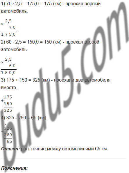 Из двух пунктов, расстояние между которыми равно 260 км, навстречу друг другу одновременно выехали два автомобиля. Скорость одного автомобиля равна 70 км/ч, а скорость второго - 60 км/ч. Какое расстояние будет между автомобилями через 2,5 ч после начала движения?
