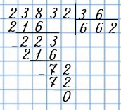 Разделю 23 832 на 36. Выделю первое неполное делимое - 238. Разделю 23 на 3, получу 6 - это пробная цифра.