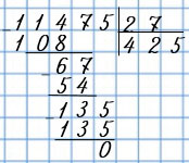 Умножу 27 на 5, получу 135. Это больше, чем 114, значит, в частном должно быть меньше, чем 5. Пробую, подходит ли цифра 4.