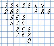 Нахожу вторую цифру частного: 67 : 27. Разделю 6 на 2, получу 3 - это пробная цифра.