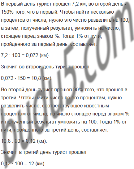 В первый день турист прошел 7,2 км, во второй день - 150% того, что в первый. Сколько километров прошел турист за три дня, если во второй день он прошел 90% того, что прошел в третий?