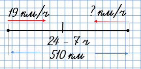 21. 1) От двух пристаней, находящихся на расстоянии 510 км, отплыли в 7 ч навстречу друг другу катер и моторная лодка. Встреча произошла в 24 ч этого же дня. Катер шёл со скоростью 19 км/ч. С какой скоростью шла лодка?