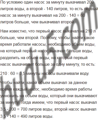 Два насоса одновременно выкачивали воду из бассейна. Один насос за минуту выкачивал 200 л воды, а второй - 140 л. Сколько времени работали насосы и сколько воды выкачал каждый из них, если первый насос выкачал на 210 л больше, чем второй?
