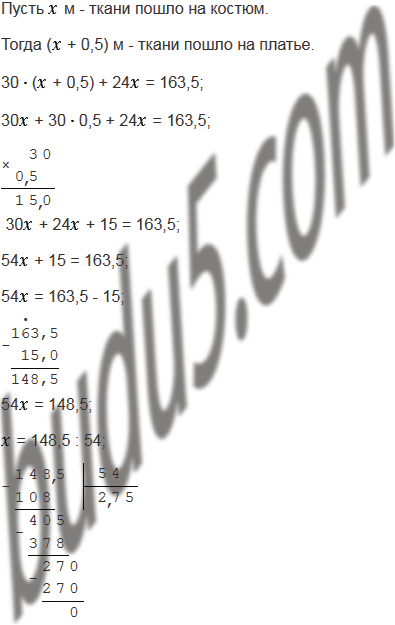 У принцессы Моды было 30 платьев и 24 маскарадных костюма, на пошив которых пошло 163,5 м ткани. На каждое платье потратили на 0,5 ткани больше, чем на каждый костюм. Сколько ткани пошло на одно платье и сколько - на один костюм?