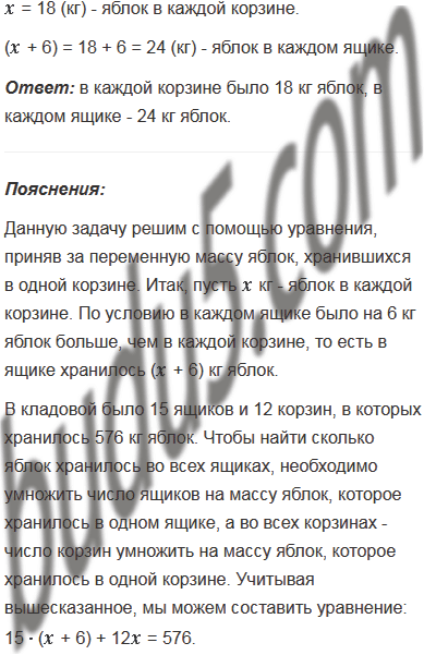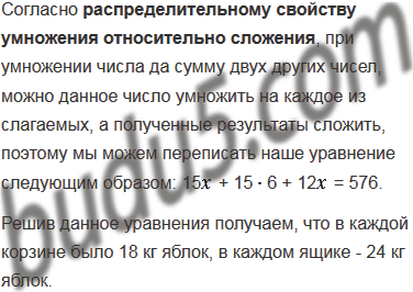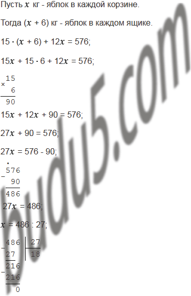 В кладовой было 15 ящиков и 12 корзин, в которых хранилось 576 кг яблок, причём в каждом ящике было на 6 кг яблок больше, чем в каждой корзине. Сколько килограммов яблок было в каждом ящике и сколько в каждой корзине?