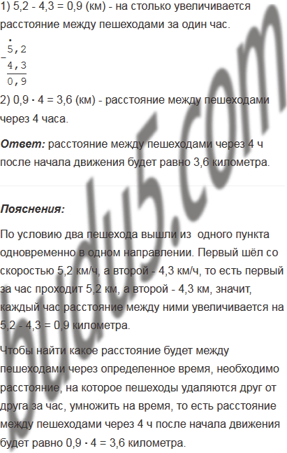 Из одного пункта в одном направлении одновременно вышли два пешехода. Один идёт со скоростью 5,2 км/ч, а второй - 4,3 км/ч. Какое расстояние будет между ними через 4 ч после начала движения?