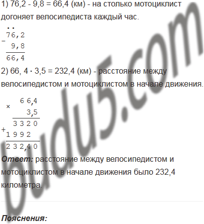 Из двух пунктов в одном направлении одновременно выехали велосипедист и мотоциклист. Мотоциклист двигался со скоростью 76,2 км/ч и догнал велосипедиста, который двигался со скоростью 9,8 км/ч, через 3,5 ч после начала движения. Найдите, какое расстояние было между велосипедистом и мотоциклистом в начале движения.