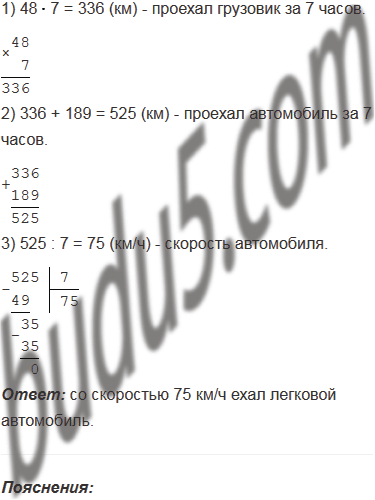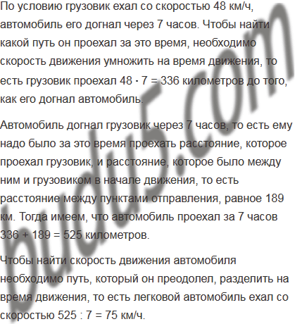 Из двух пунктов, расстояние между которыми равно 189 км, одновременно в одном направлении выехали грузовик и легковой автомобиль. Грузовик ехал со скоростью 48 км/ч, и через 7 ч после начала движения его догнал легковой автомобиль. С какой скоростью ехал легковой автомобиль?